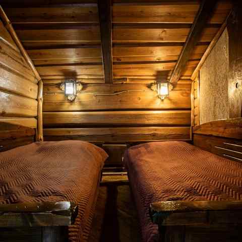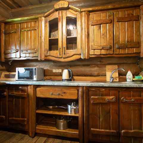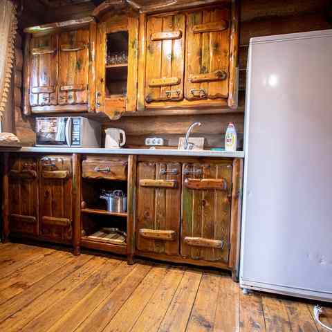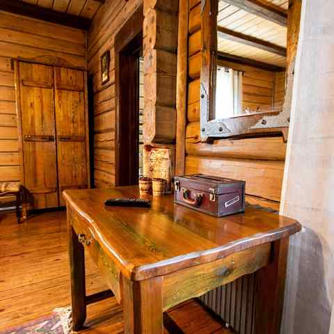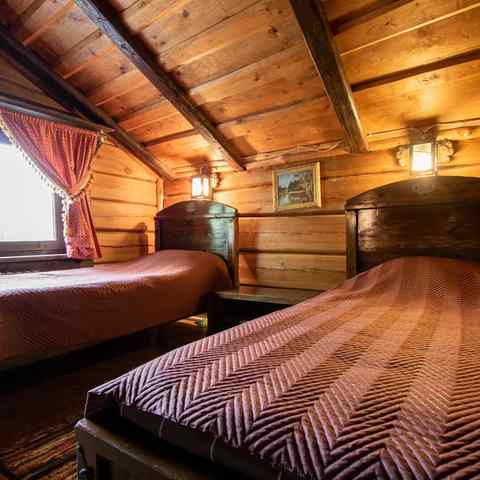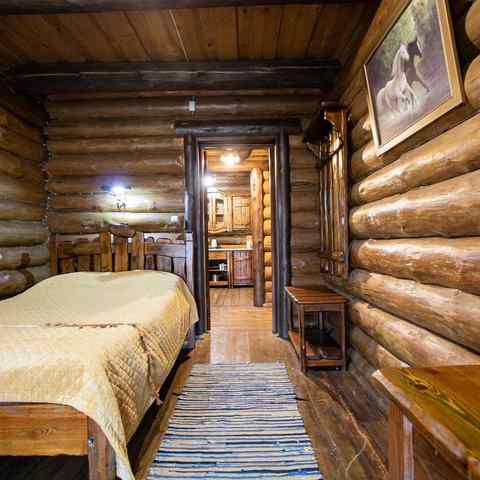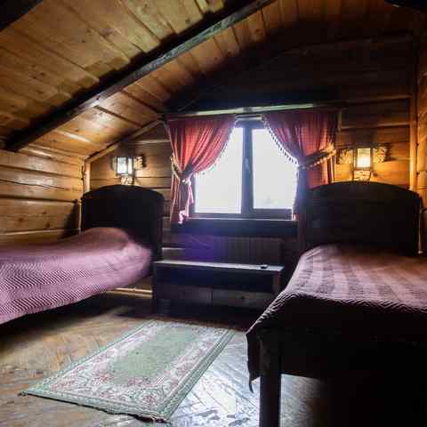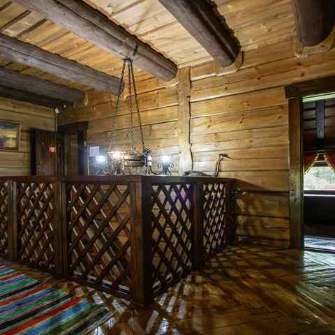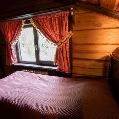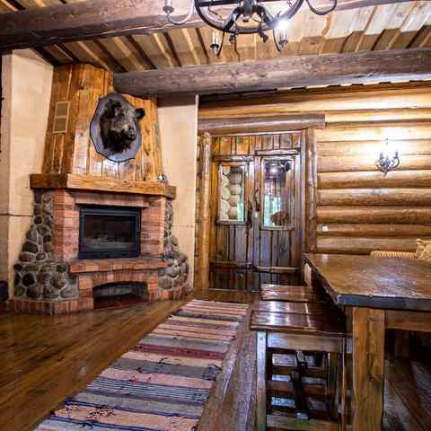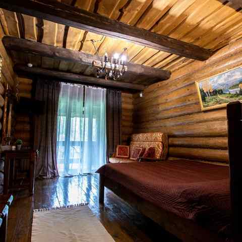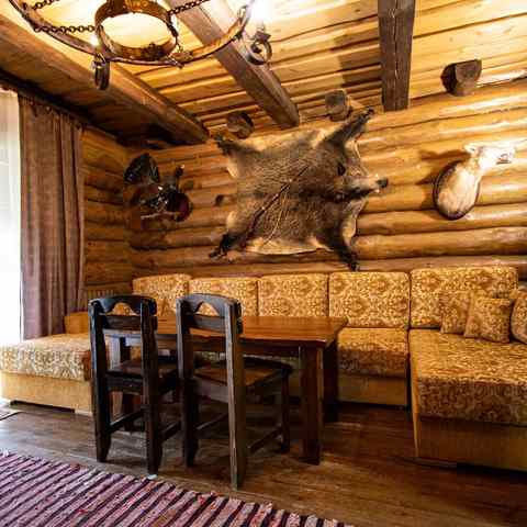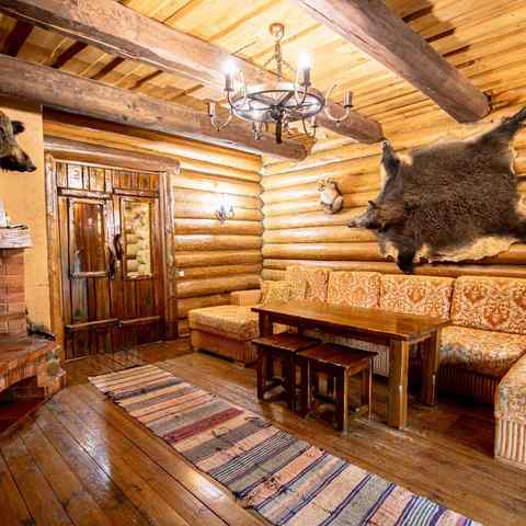 Гостям предлагается двухэтажный дом с 7 номерами и 4 отдельные коттеджа. Все постройки оснащены современными удобствами: санузлы, душевые, горячее водоснабжение, автономное отопление, спутниковое ТВ, Wi-Fi. Интерьеры выдержаны в деревенском стиле с белорусским колоритом: много дерева, кованые элементы, гобелены, охотничьи трофеи, ручная работа ремесленников.